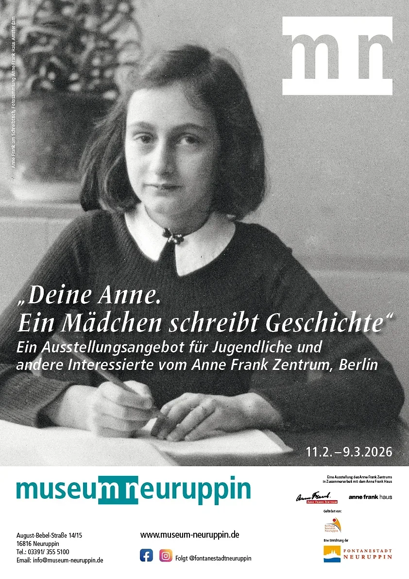 Das Museum Neuruppin zeigt vom **11.2. bis zum 9.3.2026** die Wanderausstellung „Deine Anne. Ein Mädchen schreibt Geschichte“. Die Ausstellung des Anne Frank Zentrums in Berlin erzählt die bewegende Lebensgeschichte von Anne Frank und lädt Jugendliche dazu ein, sich mit Antisemitismus, Rassismus, Diskriminierung sowie den Werten Freiheit, Gleichberechtigung und Demokratie auseinanderzusetzen.