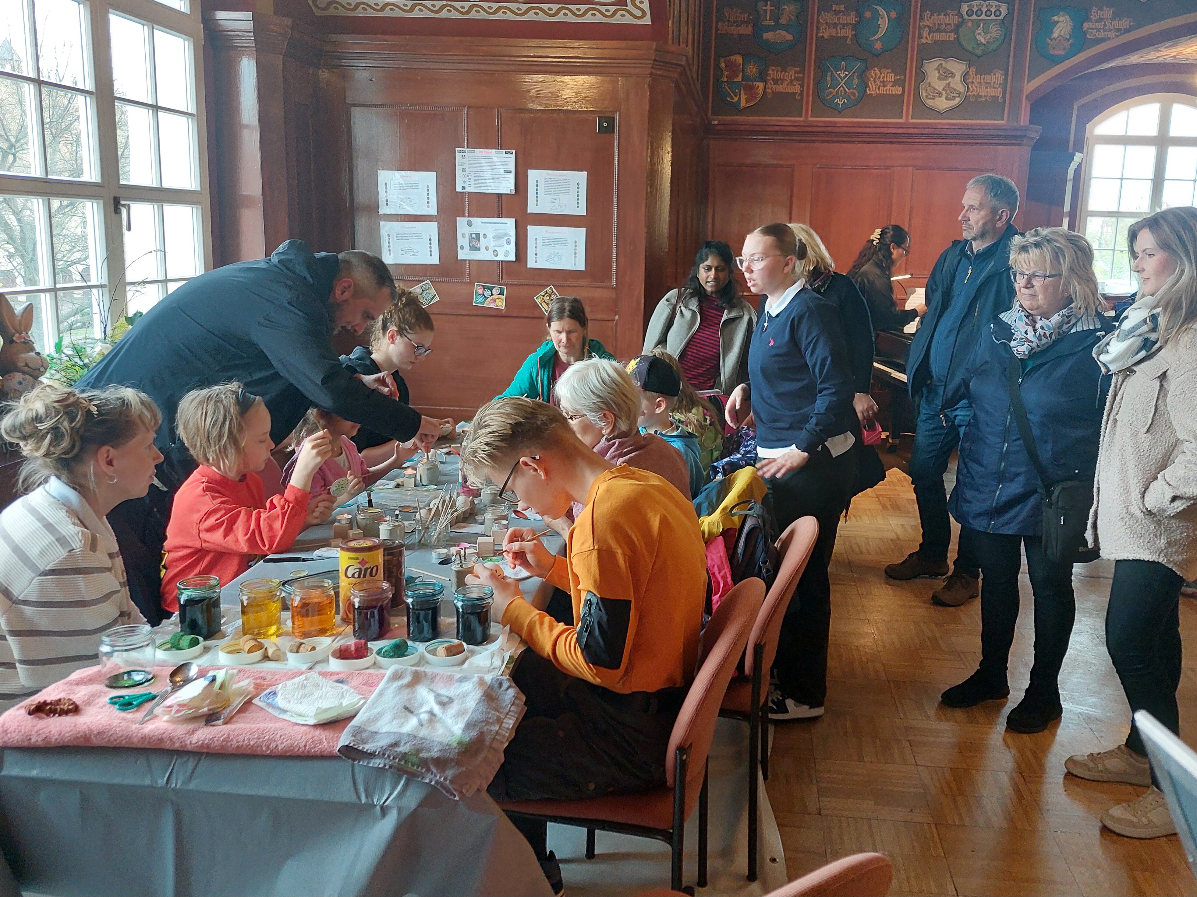 Mit verschiedenen Bastelständen und Mitmachstationen sowie Livemusik am Akkordeon laden wir alle in den Wappensaal ein. Sorbische Ostereier können mittels der Wachsbossiertechnik selbst gestaltet werden. Wer Lust hat, kann Osterdeko filzen oder die Schreibkunst der Kalligraphie ausprobieren. Leckere Häppchen, Kaffee und selbstgebackener Kuchen sorgen für das leibliche Wohl. Ein kleiner Ostermarkt mit Keramik, Deko, Schmuck und Honigprodukten rundet das Programm ab.
